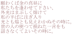 ラストだけは決まっていたのですが(勿論、上記の詩から。初めにこの詩ありき、でしたので)、途中は悩みっぱなしでした。何で仁王はヒロインを気にかけるようになったのか、ヒロインが彼女と別れると言った時焦ったのは何故か、全然思い浮かばなくて(実は)。しかし、仁王がヒロインの笑顔を見た瞬間と、ヒロインが「期待なんてしたくなかった」と思うところが浮かび、書き終えることが出来ました。焦った。